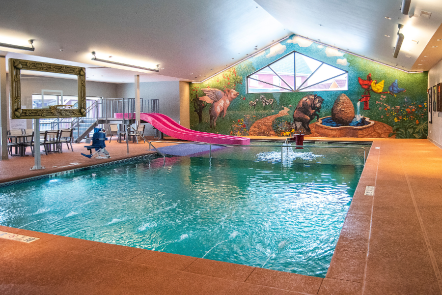 Our indoor pool area is a great way to have fun while staying inside! Our pool area has pool basketball, a water slide for the little ones, and a hot tub, too. Have fun in the water while taking in the pool art all around the area.
