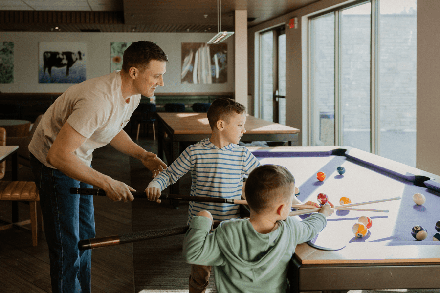 Our lobby area has pool tables and other games available to play. Enjoy laughs, family fun, and a little friendly competition with the ones you love the most.
